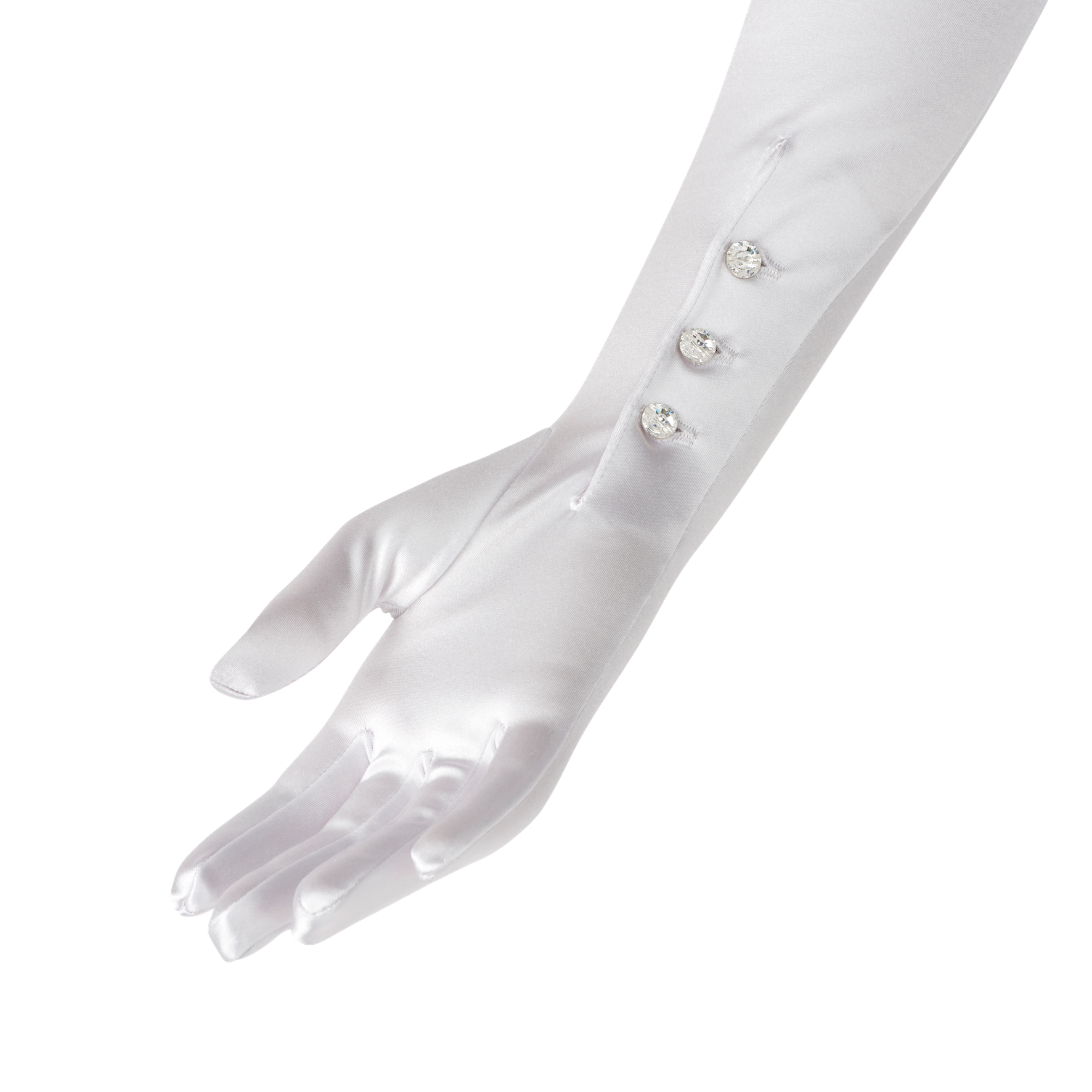 An elegant evening glove in Duchess Satin with a mousquetaire opening, ‘Antigone’ is a glove you will not want to take off. And you don’t really have to. The mousquetaire has Swarovski buttons which can be opened so that you can take your hand out of the glove and still keep your arm covered! How curiously clever...
