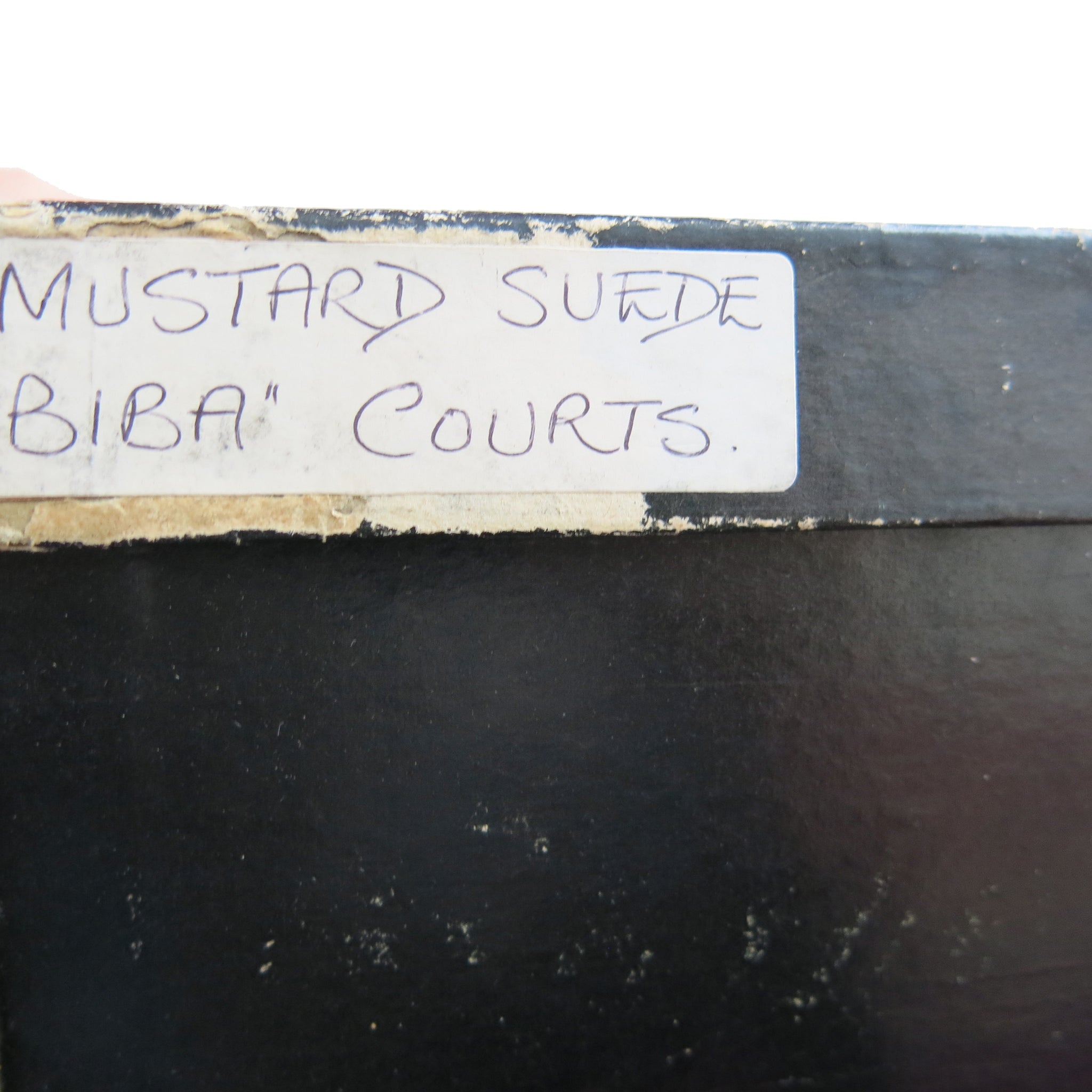 Curiously covetable original early 1970s Big Biba court shoes in mustard suede with filigree cut out detail and flower embellished elasticated strap. These shoes appear to be barely worn and are presented in a vintage Biba shoe box.