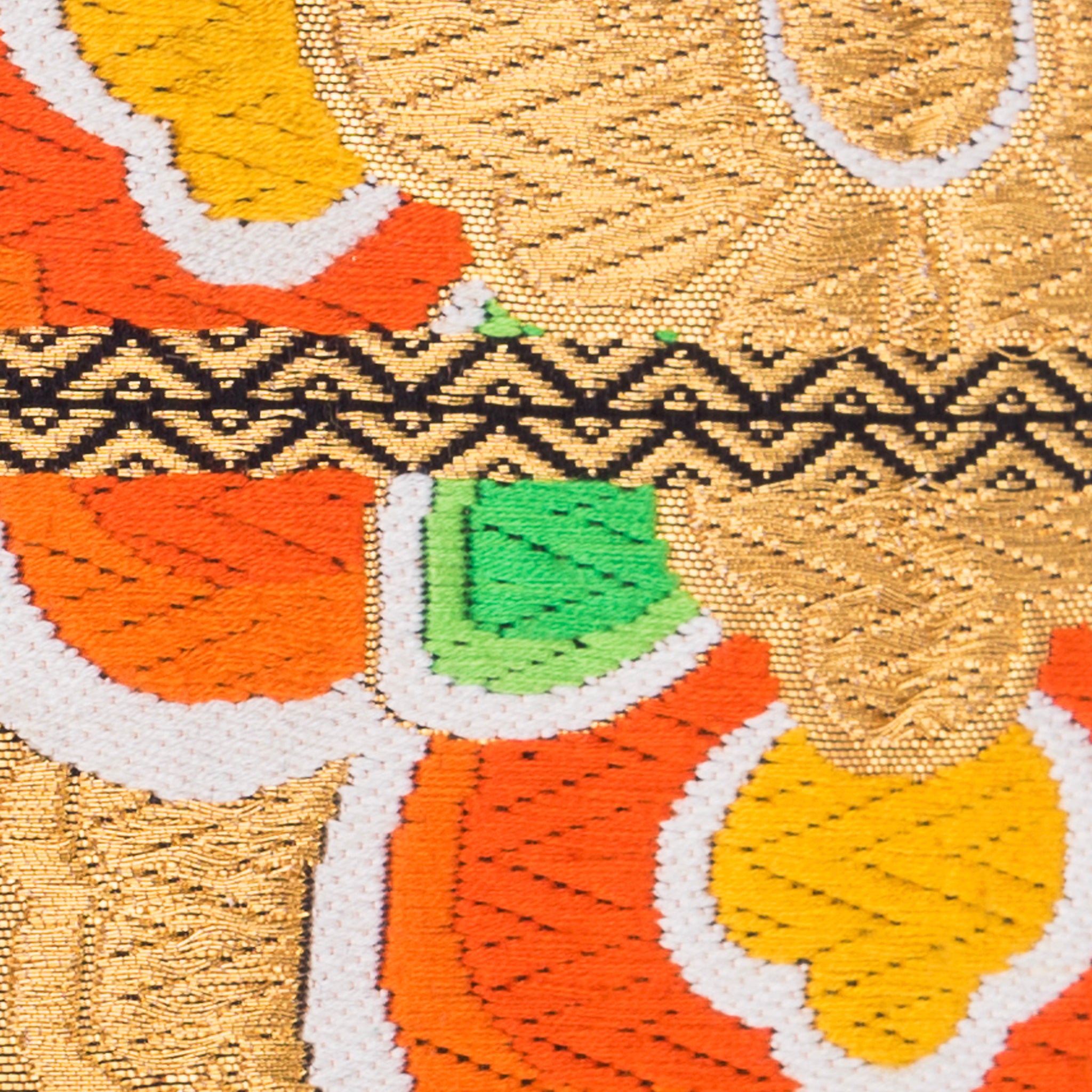 Each one of these unique clutch bags is up-cycled from a vintage Jacquard silk obi belt, sourced in Kyoto, and handcrafted in an haute couture atelier in Reims, France. One of a limited edition collection of five numbered pieces, this design features a bold gold design with a focal point of diamond shaped (hanabishi) flowers and butterflies, and has black silk lining.